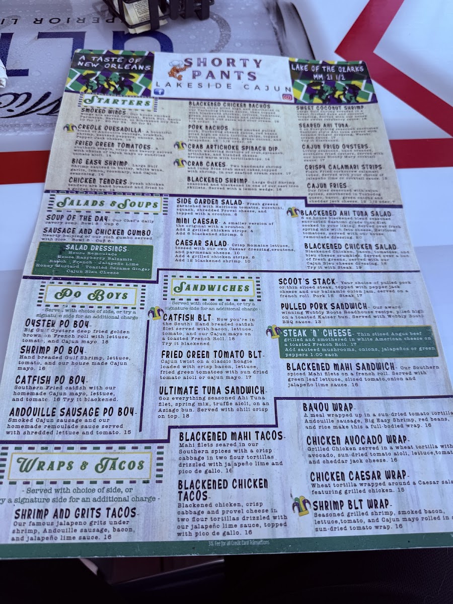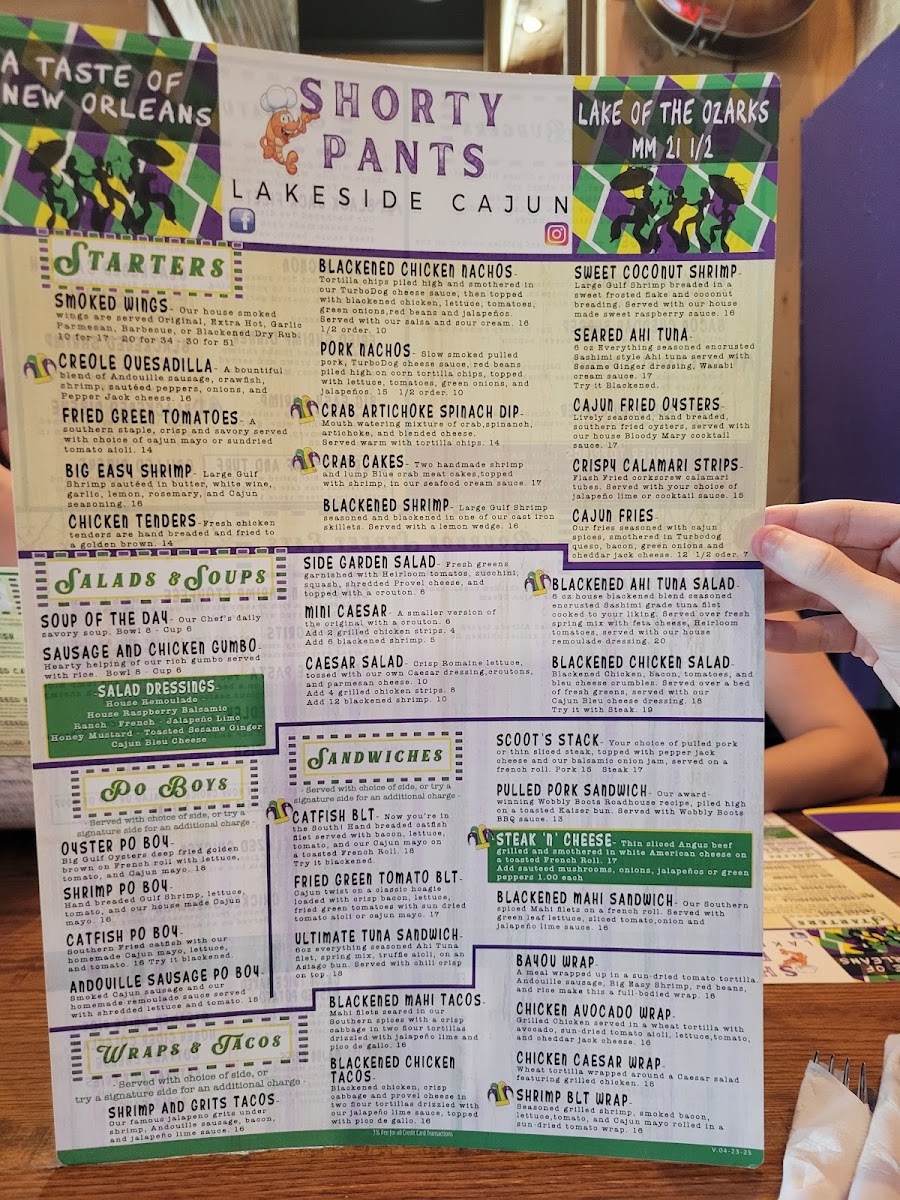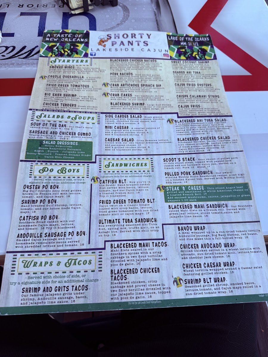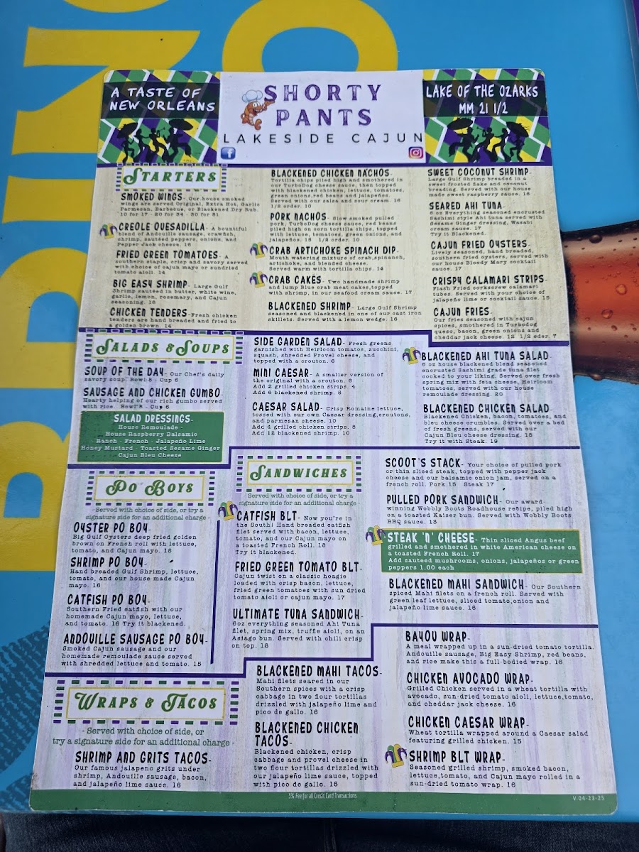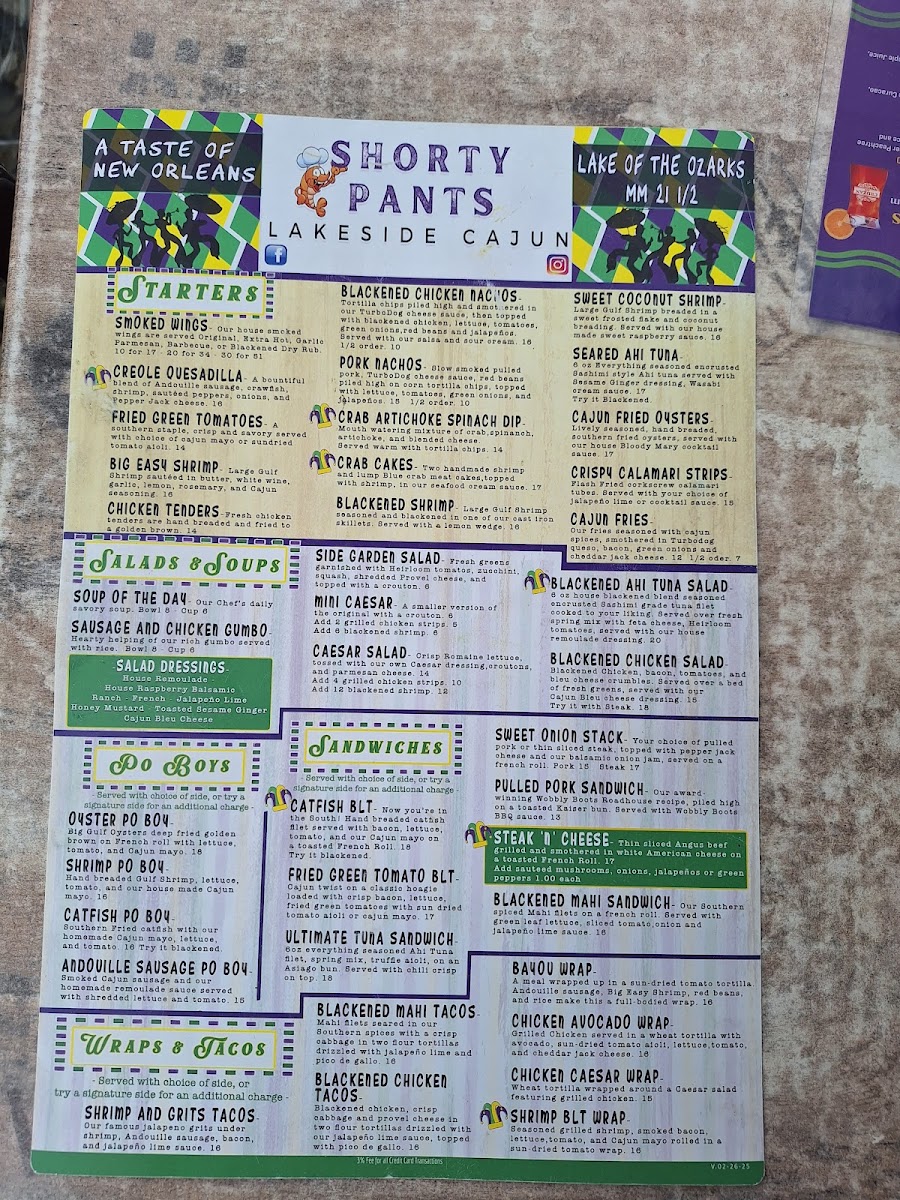 Looking for a vibrant, lakeside dining experience? The Shorty Pants Lakeside Cajun Restaurant & Marina Menu offers a delicious blend of Cajun classics with a scenic view you won’t want to miss. Located at 1680 Autumn Ln in Osage Beach, MO, this spot is perfect for grabbing a hearty meal after a day on the water or just relaxing with friends and family. Whether you're in the mood for spicy jambalaya, flavorful crawfish, or a fresh seafood platter, the menu has something for everyone. Each dish is crafted with bold Cajun spices and local ingredients, ensuring you get a true taste of the South. The laid-back atmosphere combined with mouthwatering flavors makes it an unforgettable experience. So, kick back, enjoy the stunning lakeside views, and dig into a meal that’s packed with flavor!